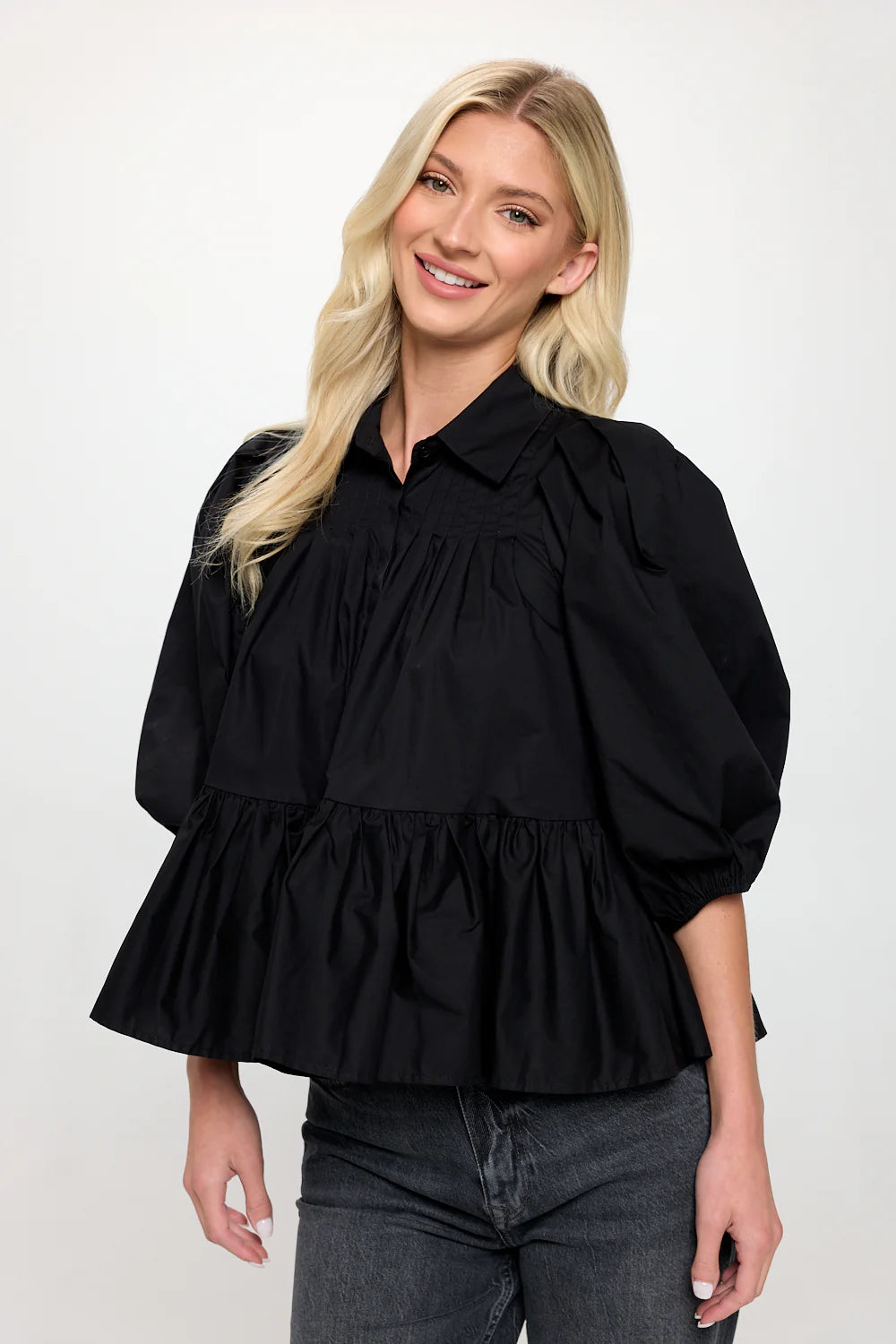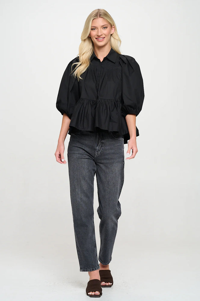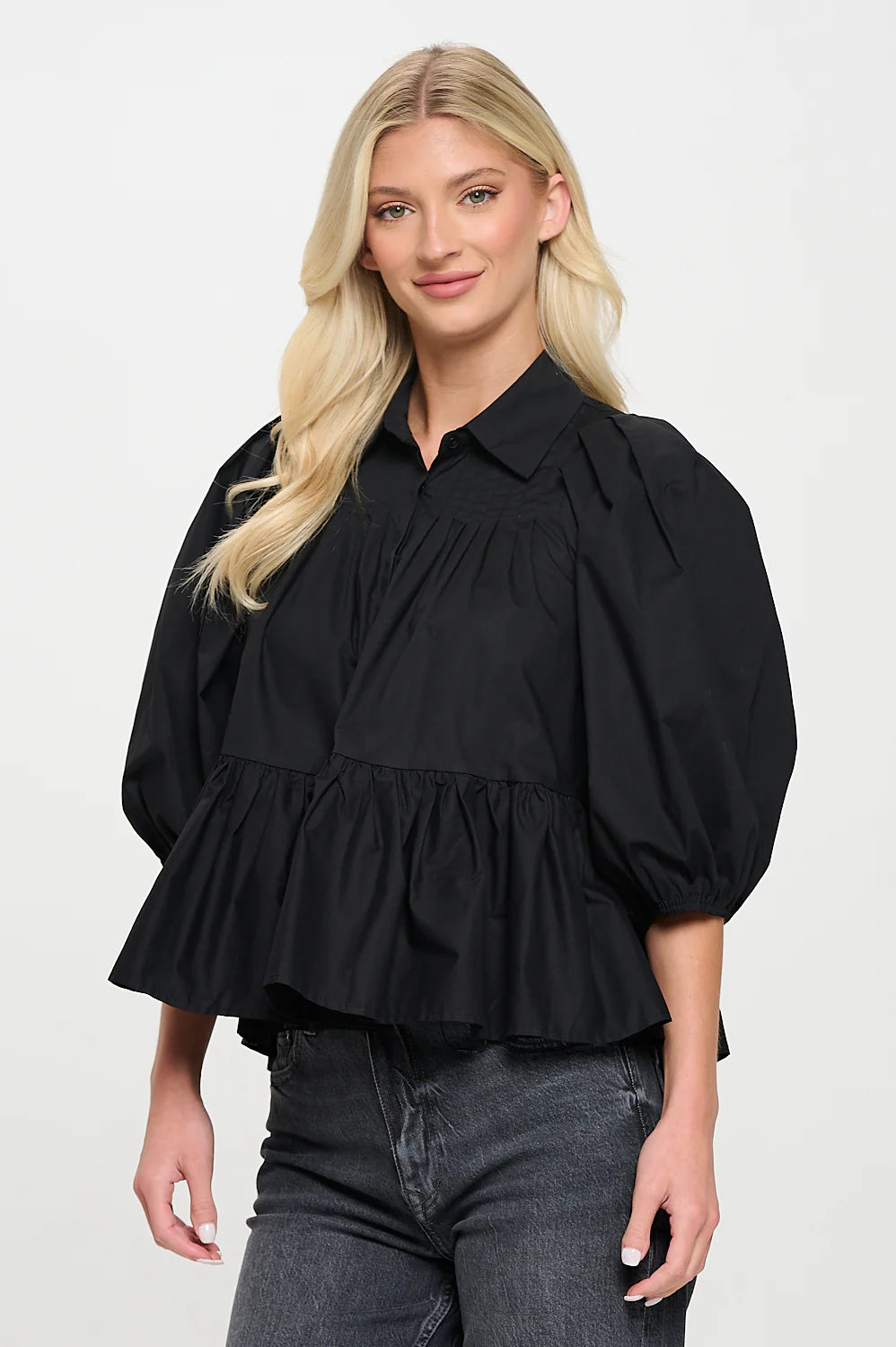 Elevate your everyday style with this chic poplin puff sleeve ruffle tiered peplum blouse. Designed with voluminous sleeves and details at the neck, this blouse offers a flattering and feminine silhouette. The peplum hem adds a touch of elegance, making it perfect for both casual and dressy occasions. The classic black color allows for versatile styling options-pair it with jeans for a casual look or dress it up with tailored pants or a skirt for a more polished ensemble. A must-have piece for your wardrobe that effortlessly combines comfort and style.