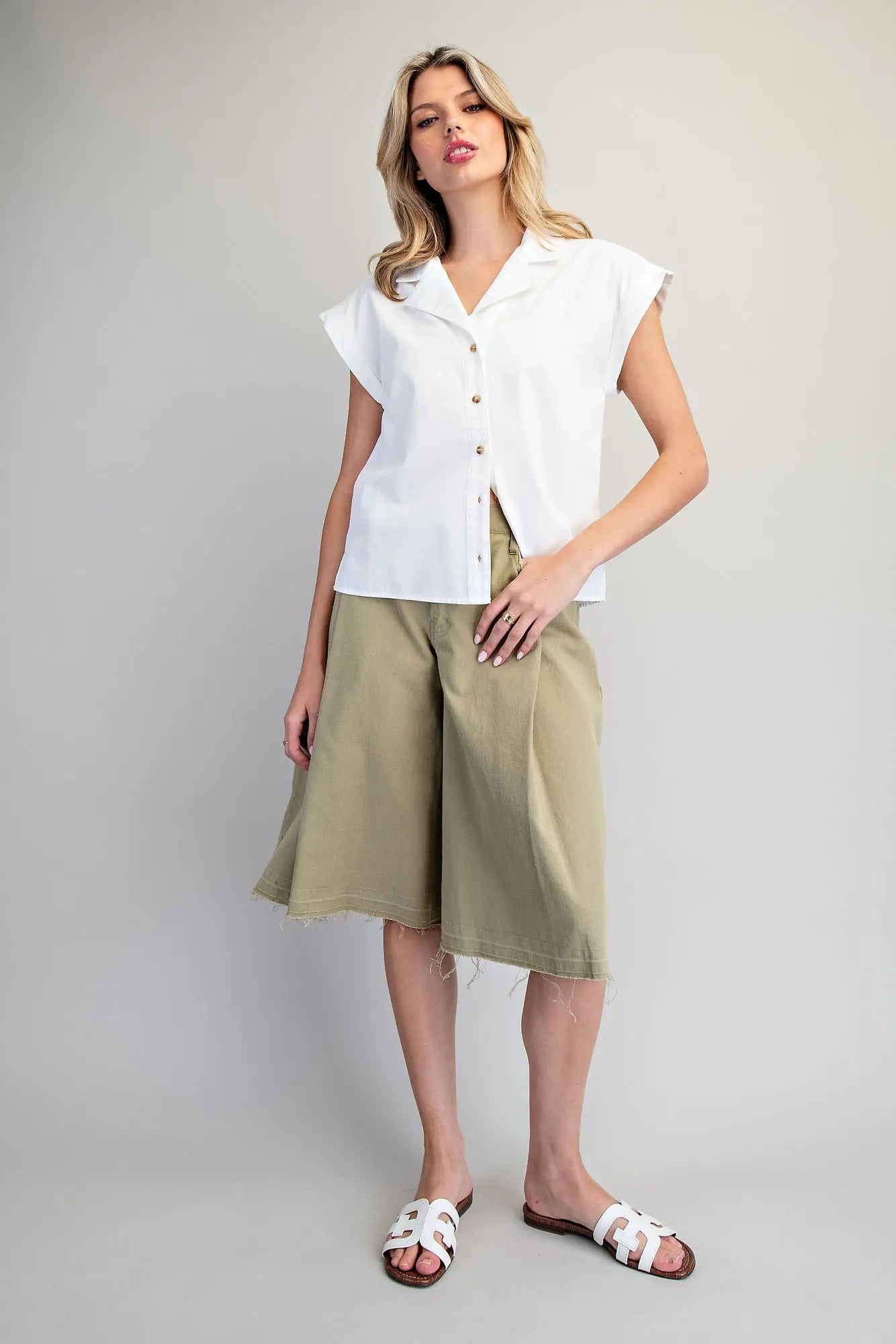 This enzyme, stone, bleach, and mineral washed top features a classic collared neckline, a full button down front, short cap sleeves, a relaxed boxy silhouette, subtle side slits, and a back pleat detail for an easy, lived in look with soft structure.