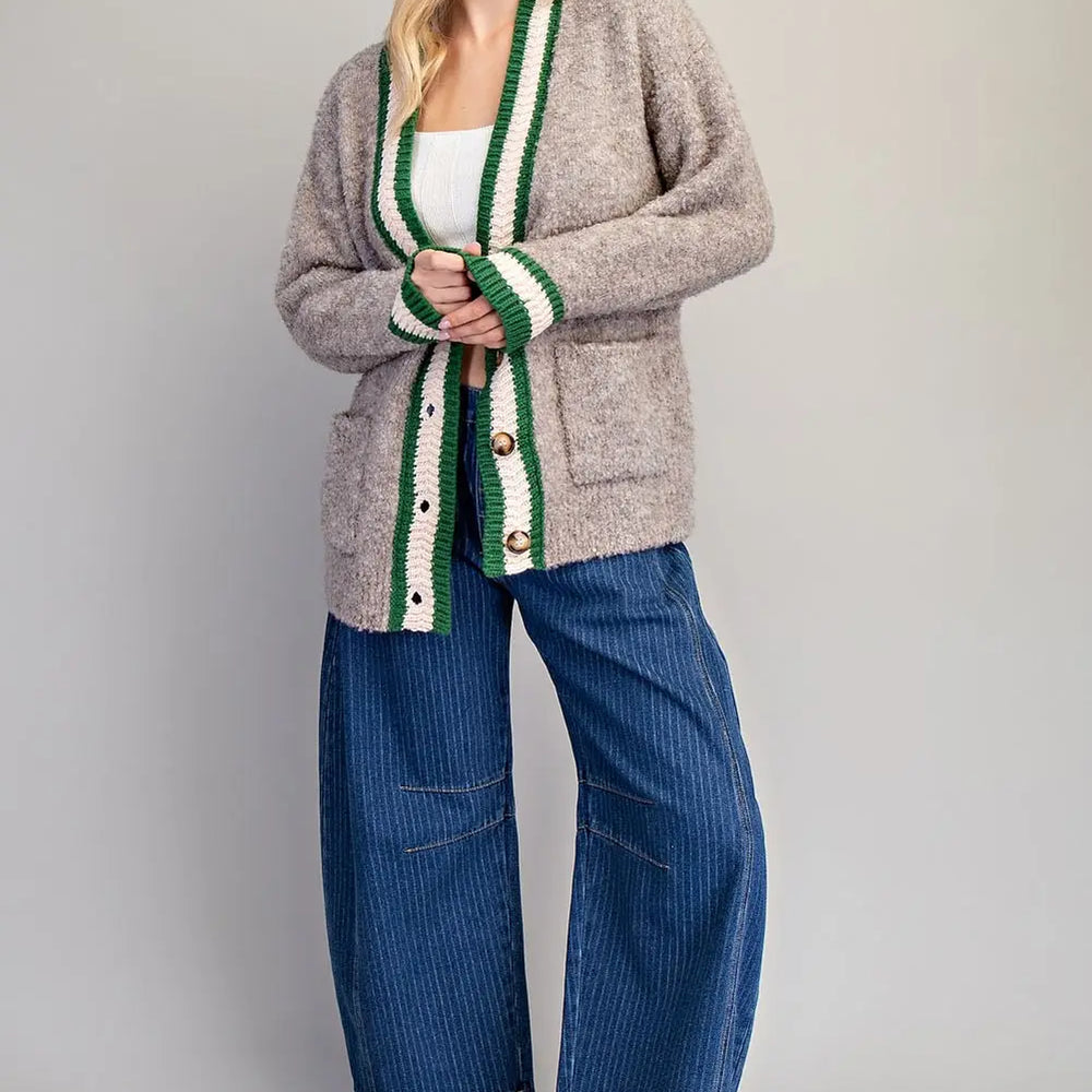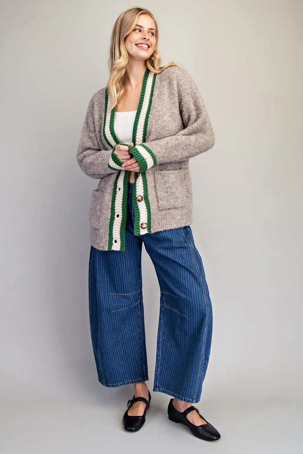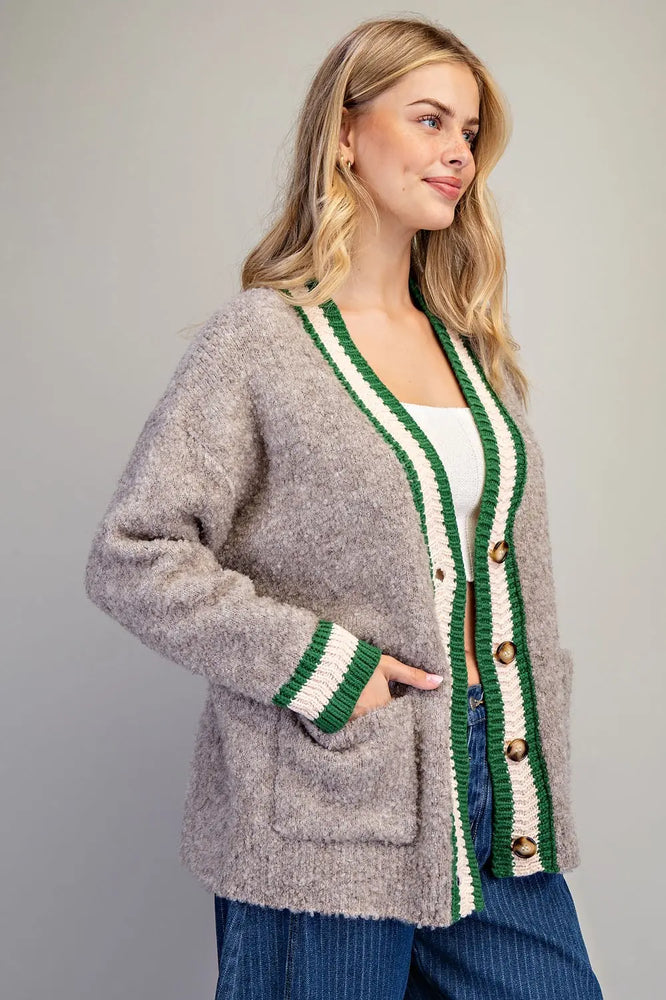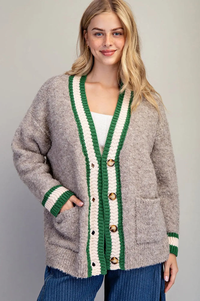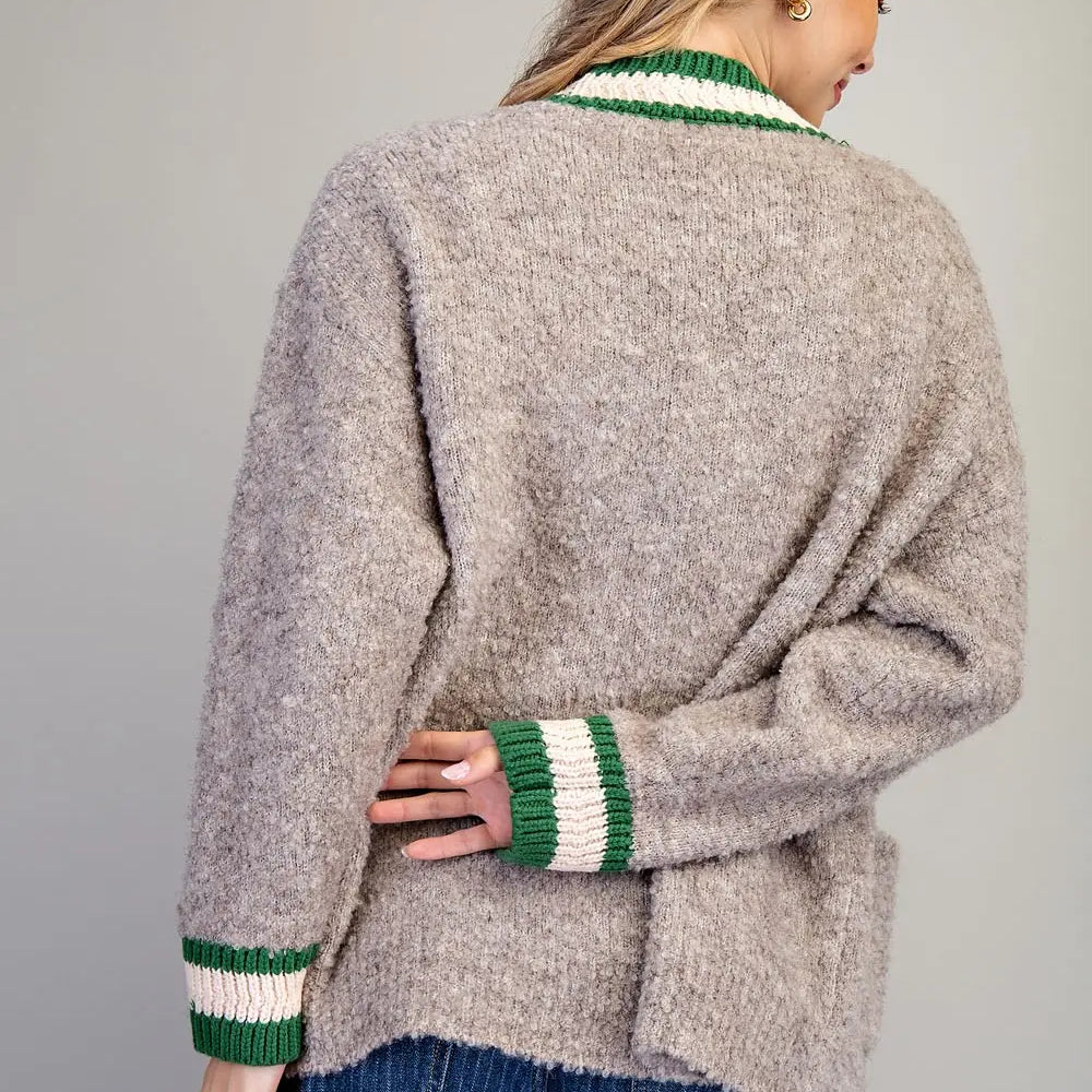 Product Detail: This cozy knit cardigan features a soft heathered texture with contrast striped ribbed trim in cream and green, a deep V-neckline with oversized button closures, dropped shoulders with long sleeves finished in striped cuffs, and front patch pockets for a casual yet preppy inspired look.