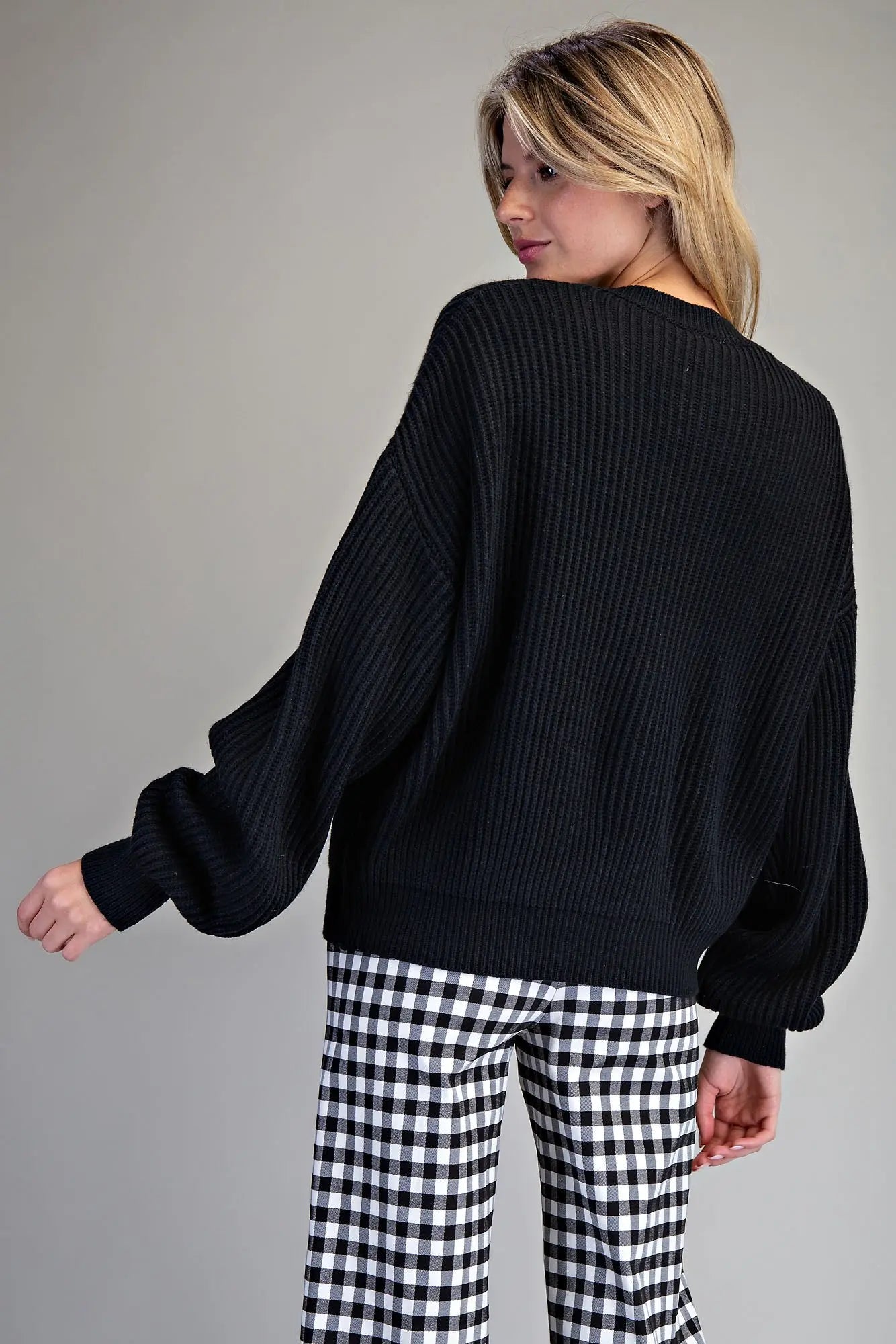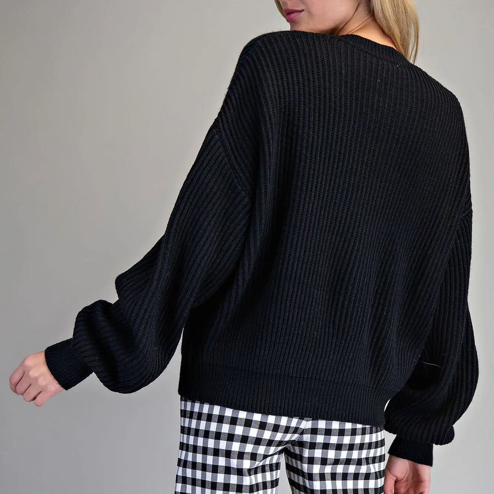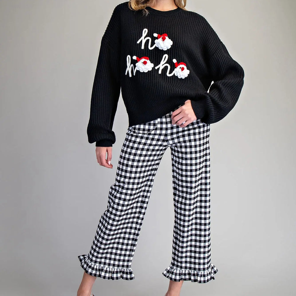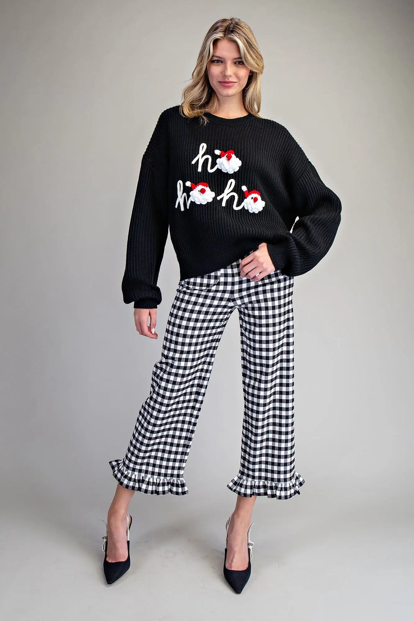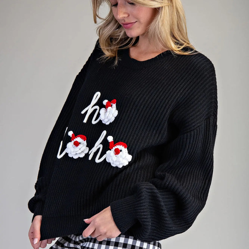 Product Detail: This festive ribbed knit sweater features dropped shoulders and ribbed trims, accented by playful "ho ho ho" lettering with 3D crocheted Santa face appliques for a cheerful holiday touch.