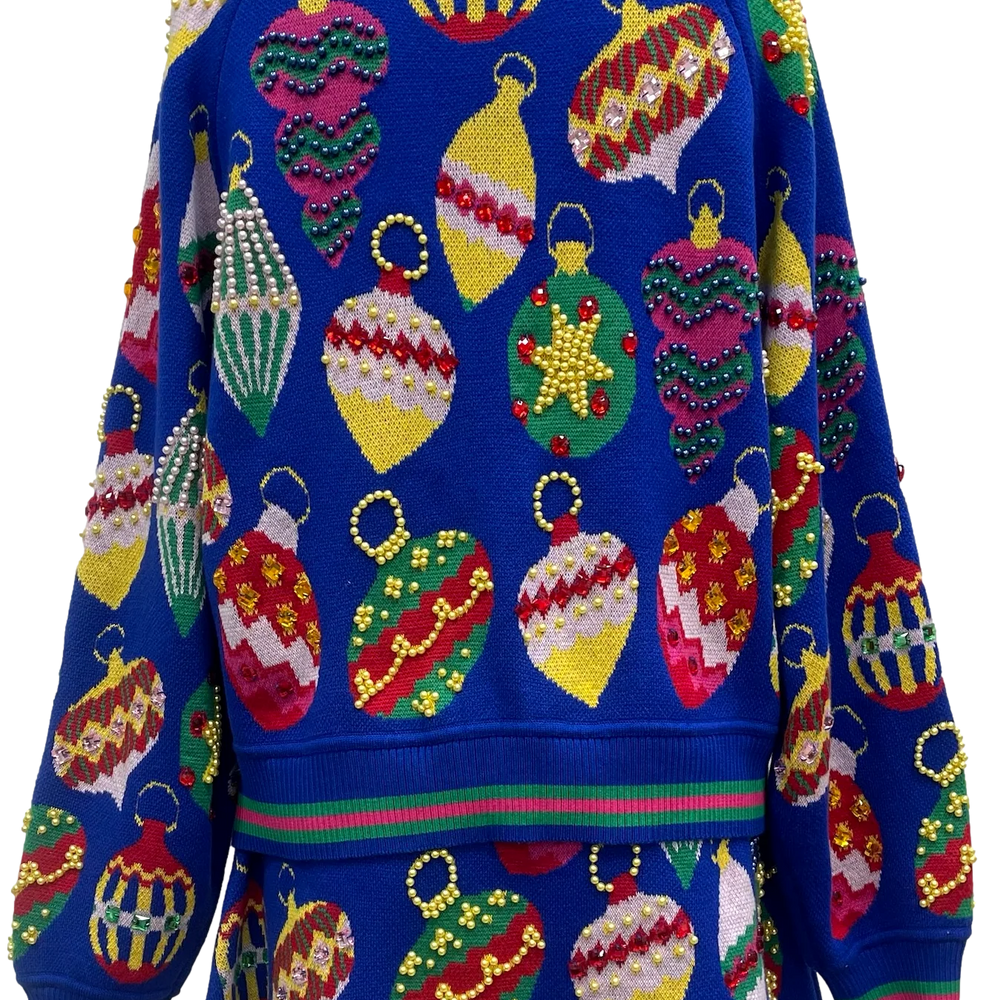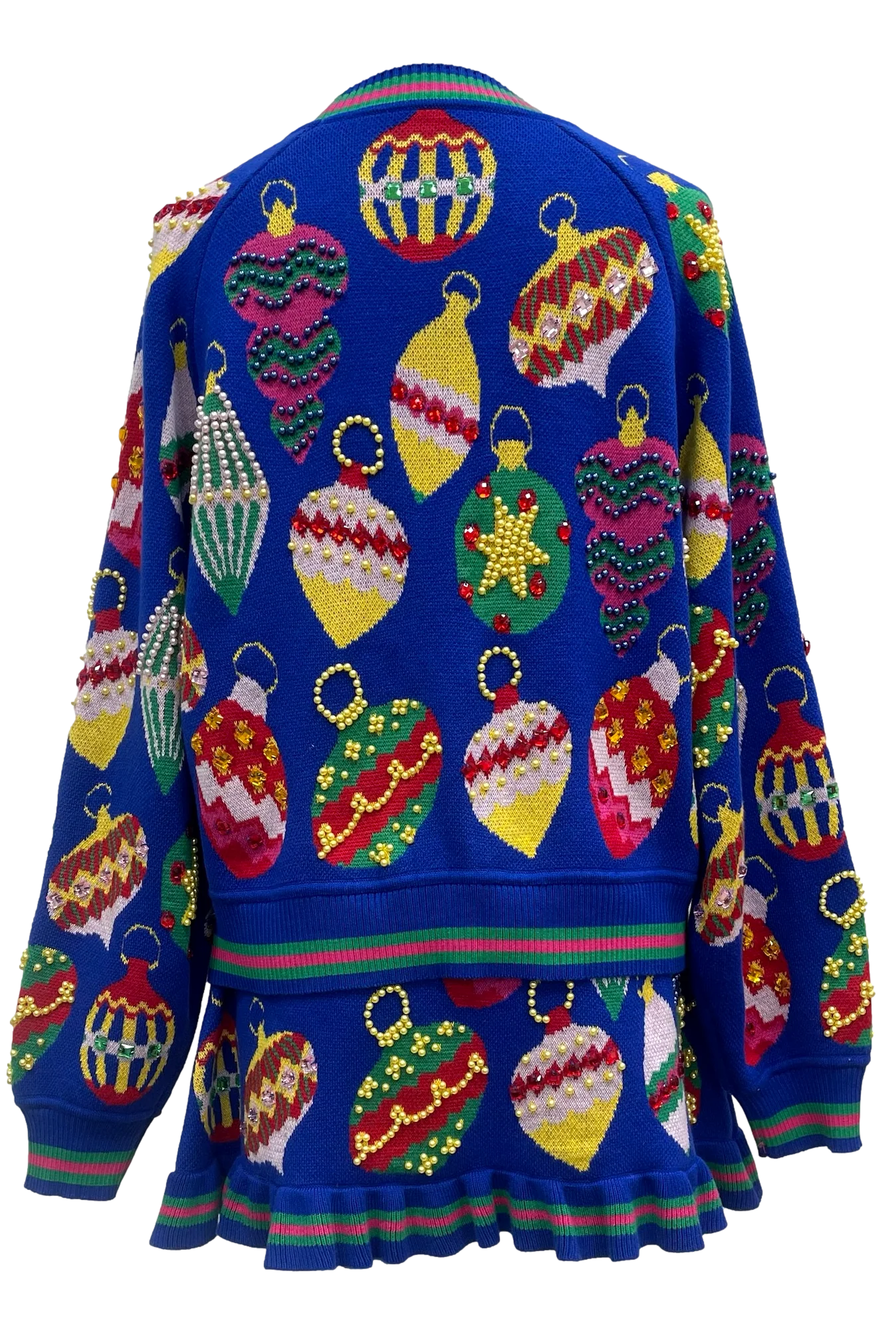 Bring the holiday spirit to life with the Queen of Sparkles Royal Blue Multi Jeweled Ornament Button Up Cardigan. Covered in vibrant Christmas ornament designs, this cardigan is adorned with shimmering jewels and beads that catch the light from every angle. Finished with striped trim and sparkling buttons, it’s the perfect blend of festive and fabulous.