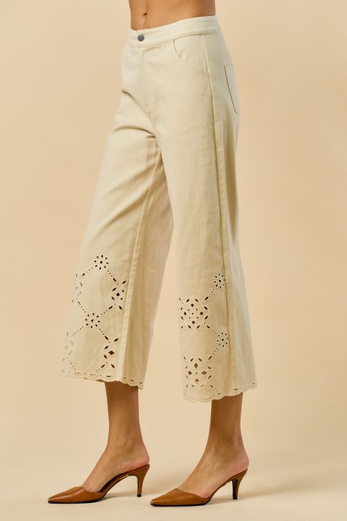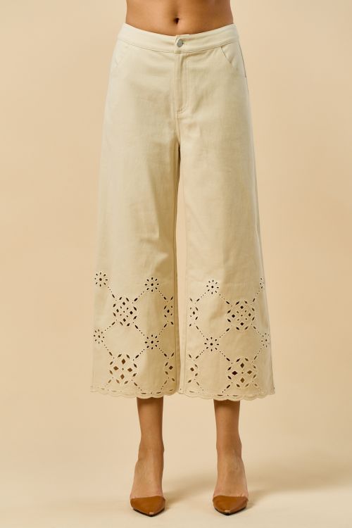 Scallop Embroidered Pants These elegant pants feature intricate scallop embroidery along the hem, adding a touch of artistry to a classic silhouette. Crafted from high-quality materials, they offer both comfort and style. The versatile design makes them suitable for various occasions, from casual outings to semi-formal events. Pair with a simple top to let the embroidery stand out.