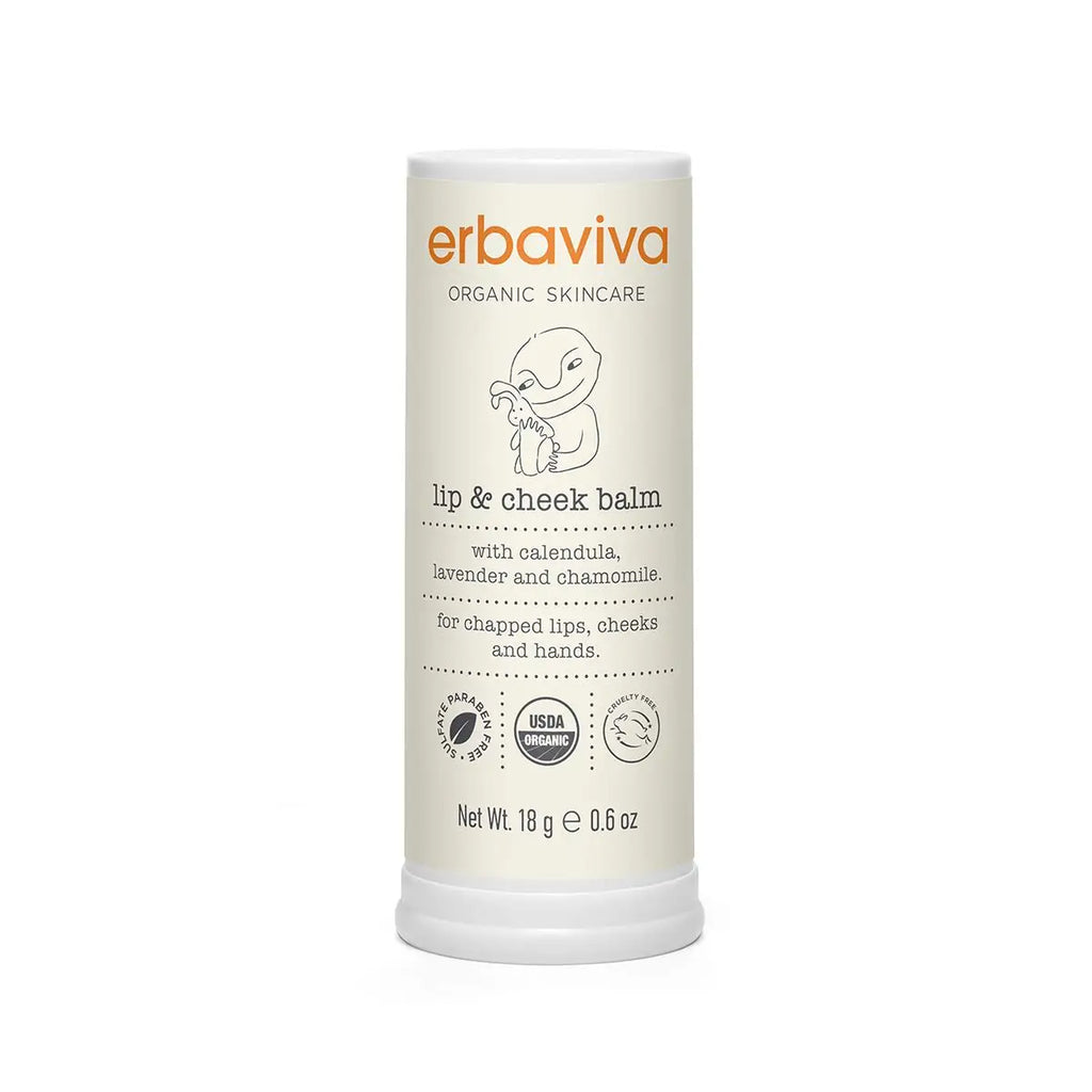 A signature award winning favorite, the nourishing erbaviva organic lip & cheek balm is a go-to healing balm for dry and chapped lips, cheeks, and hands. Glide on an abundance of good with rich shea butter to emolliate skin and organic essential oils of lavender and chamomile to calm and soothe. Calendula and rosemary extracts infuse the balm with natural antioxidants and healing properties. Creates a beneficial barrier for baby from dry and cold weather.