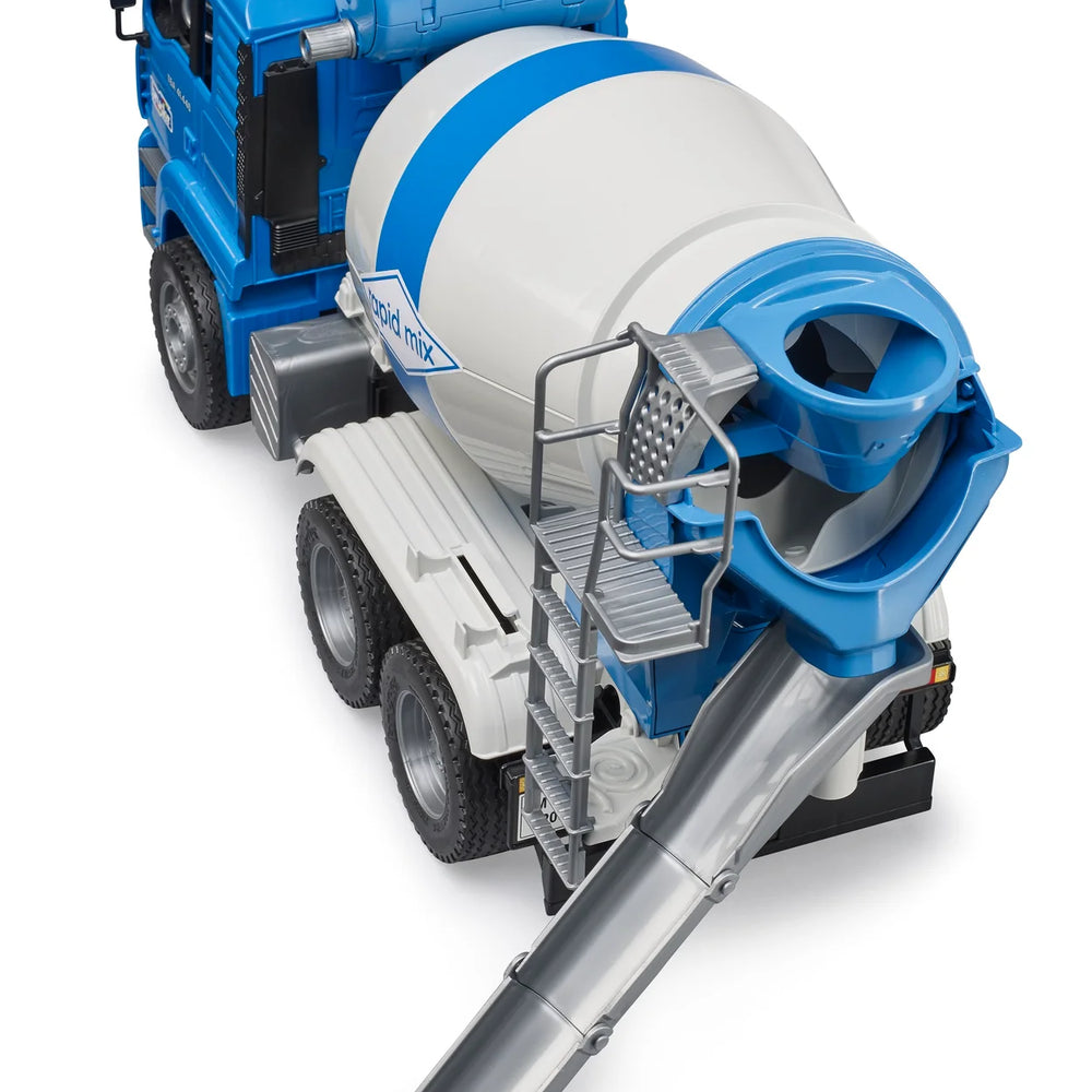 This MAN TGS Cement Mixer is the perfect all-round vehicle for construction sites, long-haul deployment, and local distribution. Turn the truck mixer drum using the hand crank on the water tank. Just like the real thing, the drum is emptied by reversing its direction of rotation. The spiral on the inside of the drum delivers the load to the discharge chute at the rear. Includes two additional drain chutes!