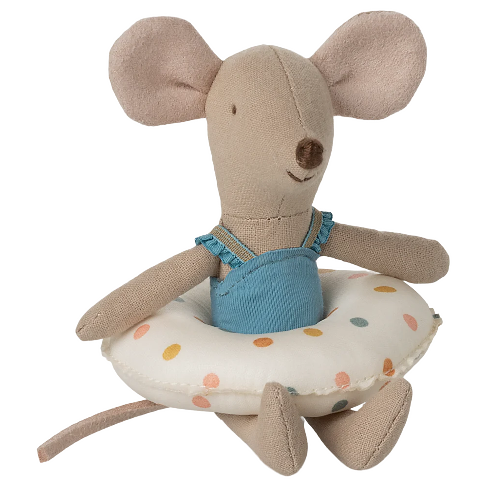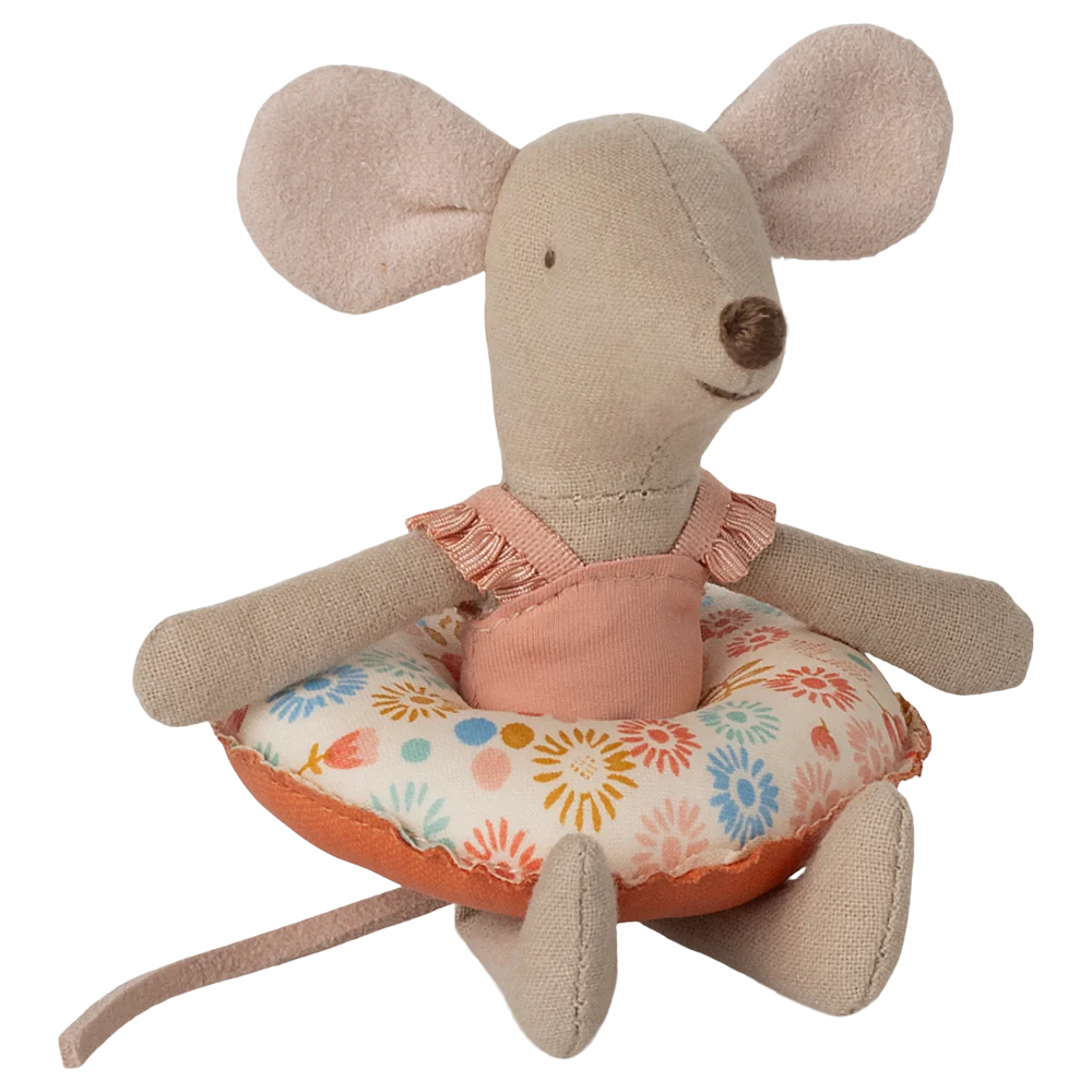 This summer set exist of a little sister mouse dressed in a rose colored swimsuit with her flower printed float around the stomach. She is now ready for a safe swim in sea.
