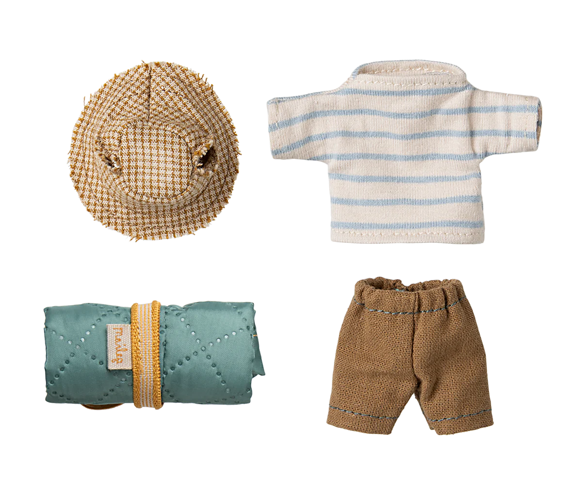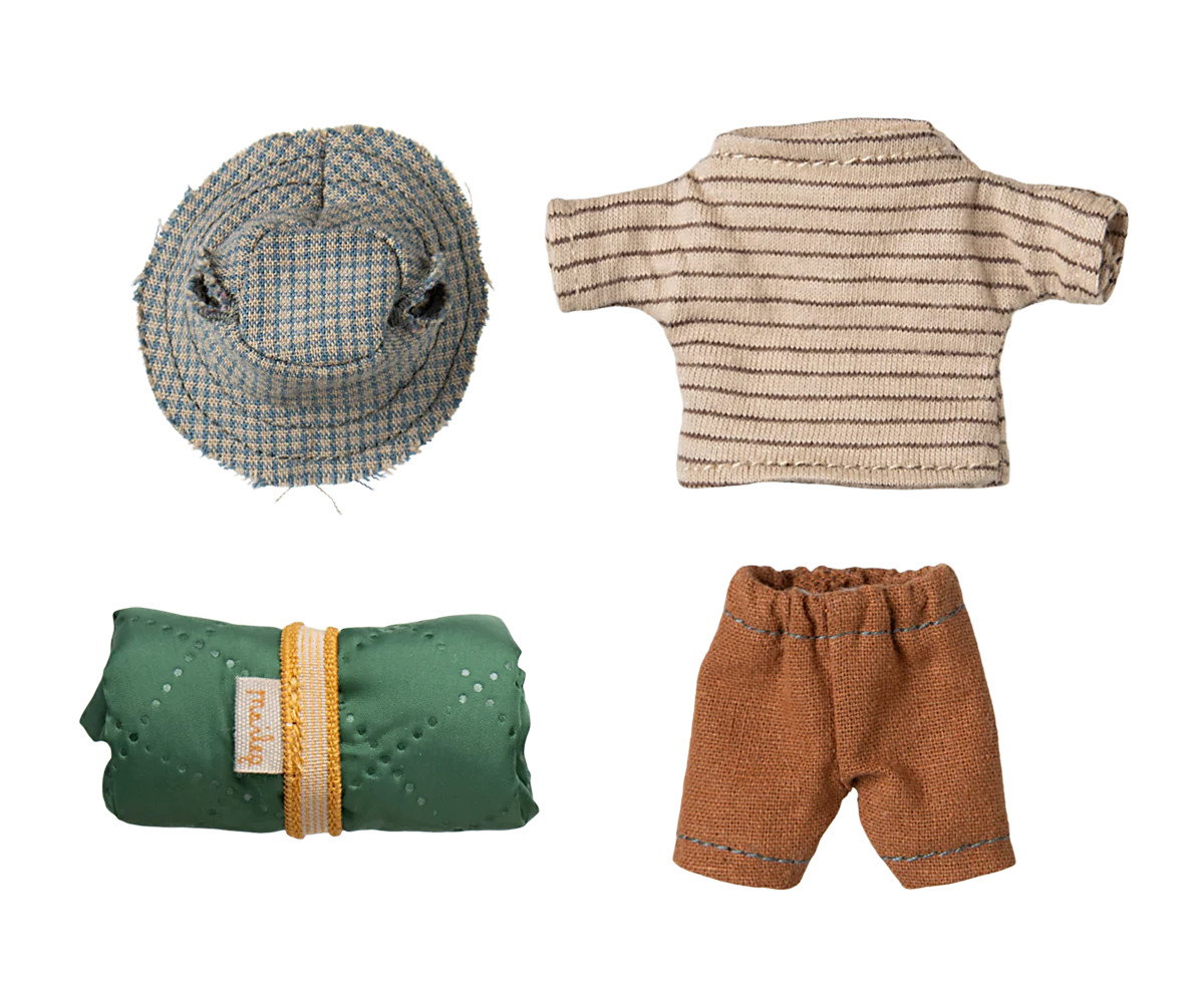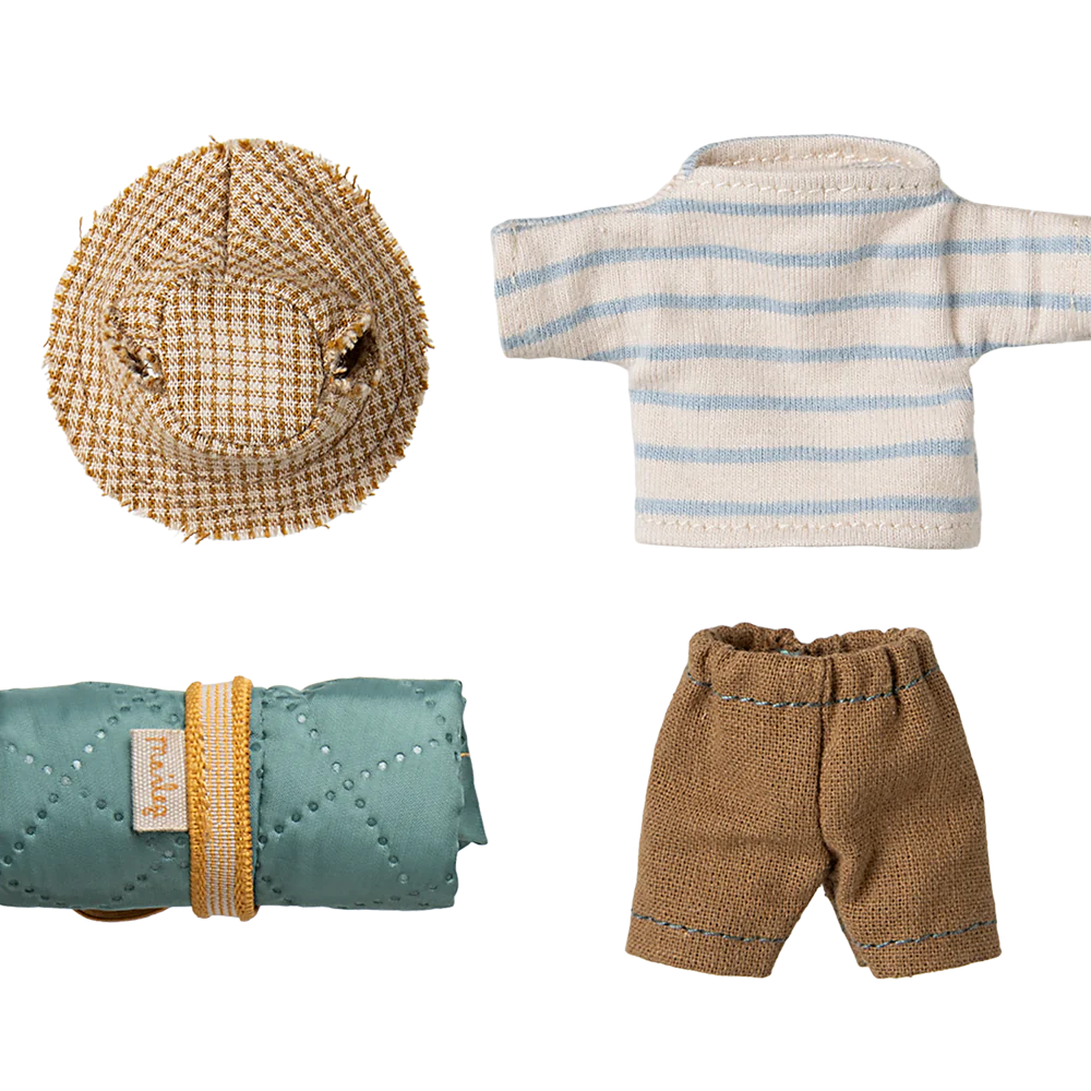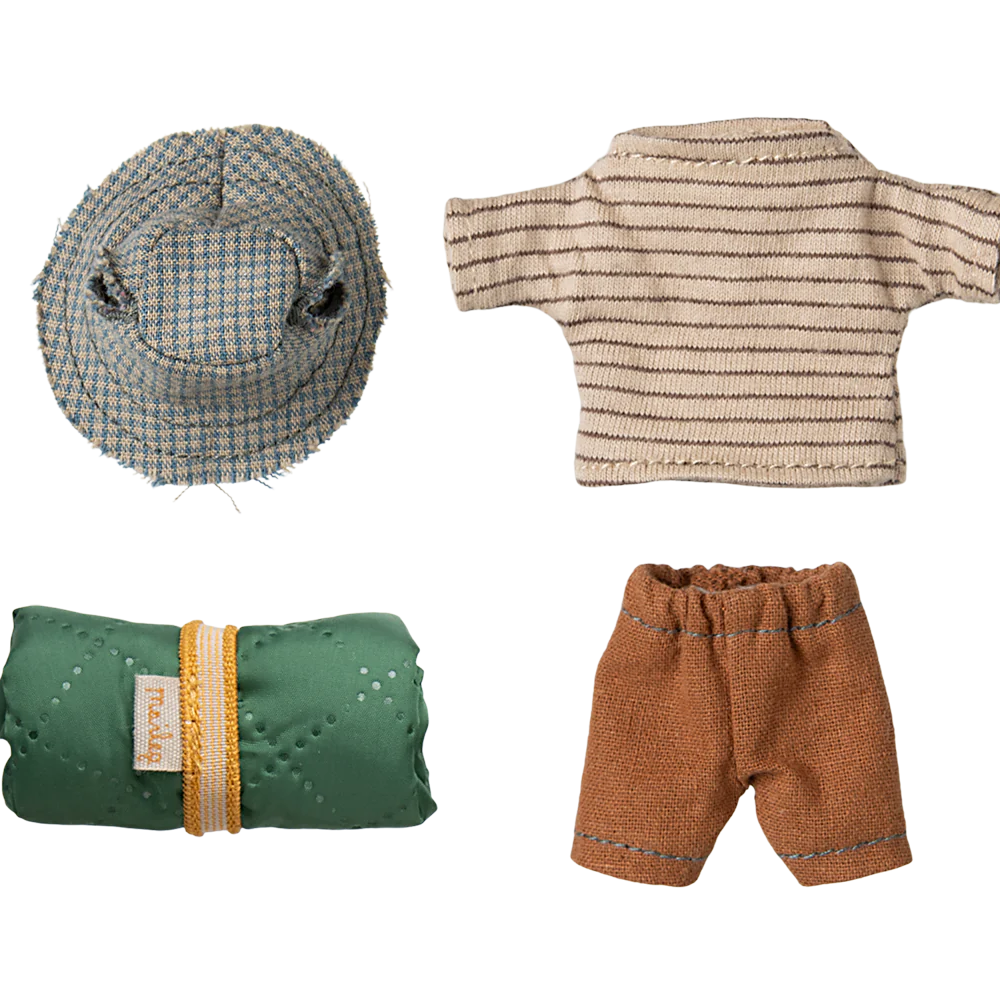 This mouse is well-prepared for a hiking trip in the wild nature. He is dressed for days of walking and brings his sleeping bag for nights under the stars. He has magnets in his hands. Add more accessories from the hiker collection for more play.