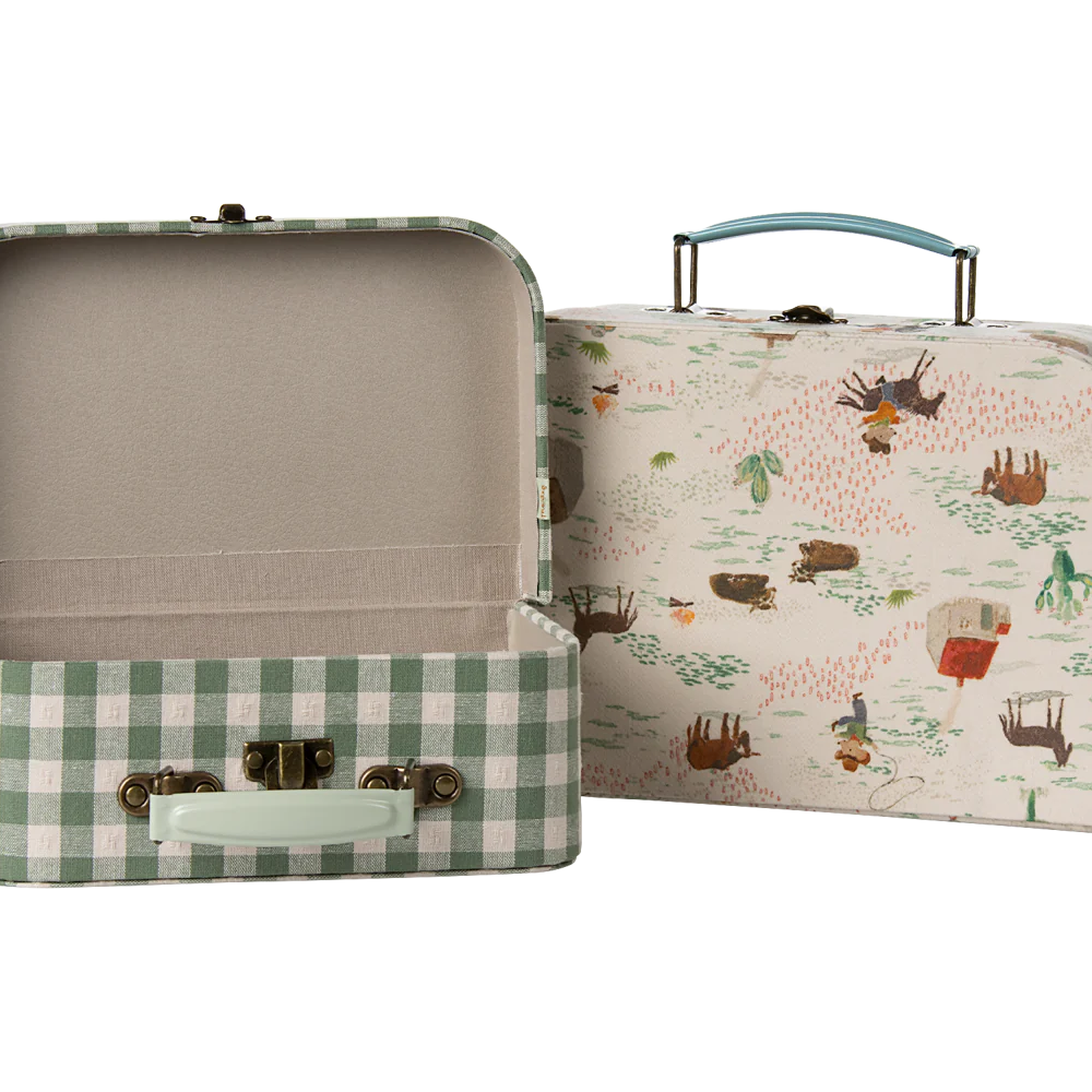 A perfect suitcase set to store all your favorite items. Each suitcase is covered by unique Maileg fabrics and has colored metal handles. This 2 pcs set is perfect for storage and for carrying your favourite toys.