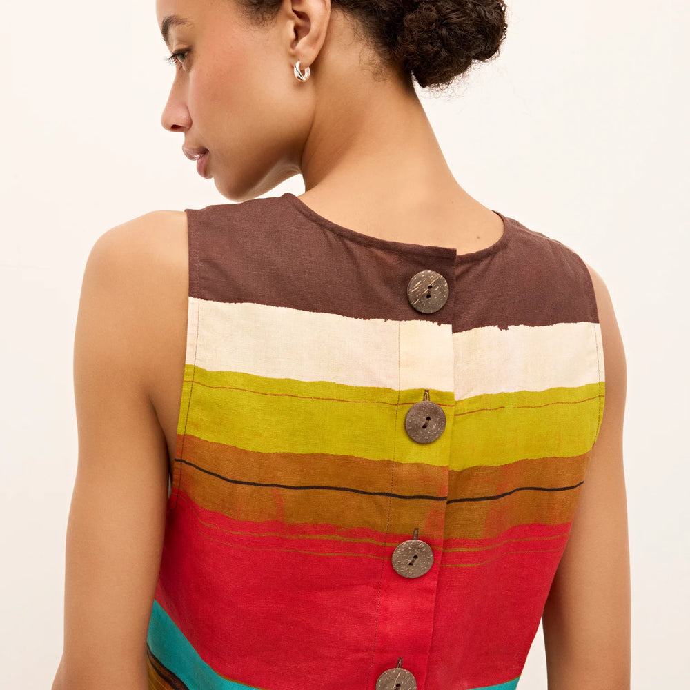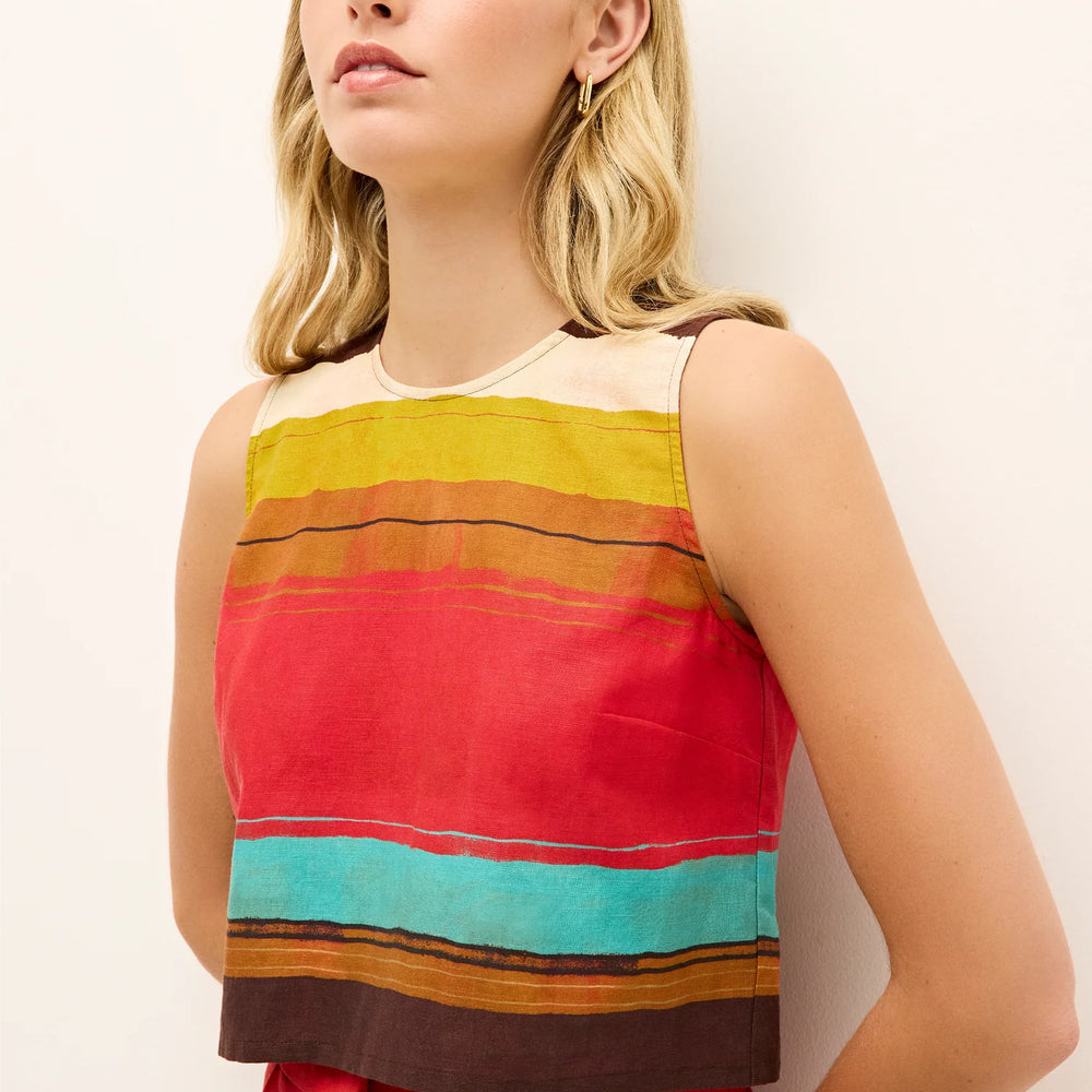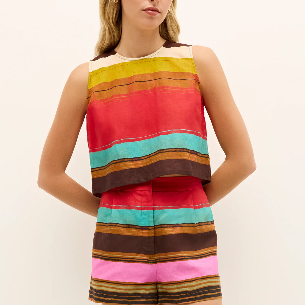 Regular price $156.90This cropped shell features wooden buttons up the back and comes in Grotto, a painterly stripe awash in red, mustard, turquoise, pink, and cream. Designed to be worn as a set, Fallon pairs effortlessly with the matching Blanche short or Sutton skirt for a summer look that channels Mediterranean ease.