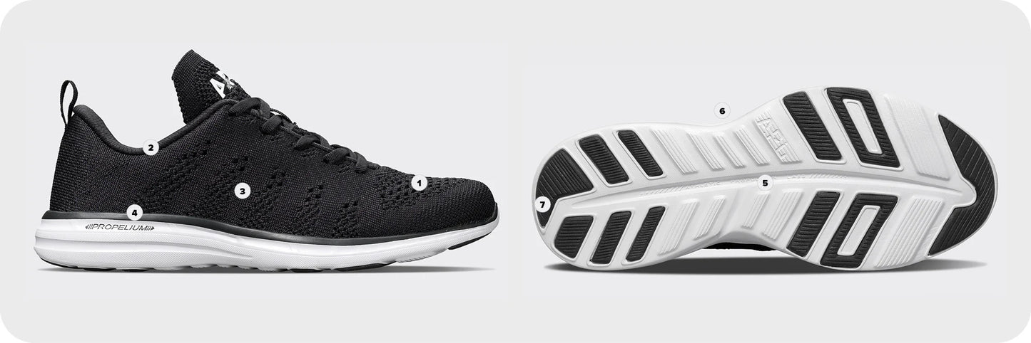 CORE COLLECTION l The iconic APL® TechLoom Pro in White/Black/Gum is our classic APL running shoe that helped start a movement and our timeless core collection colorway. The patented one piece woven upper that features innovative performance textiles creates a truly intriguing visual of different knit patterns, color palettes, levels of depth, and intricacy not seen in other footwear. Cushioning is provided by our proprietary Propelium® midsole/outsole for extreme comfort and clean looks. The TechLoom Pro is truly where performance and luxury intersect. Standard normal width sizing and a slightly wider toe box. 8mm drop. Wt. 7.9 oz.