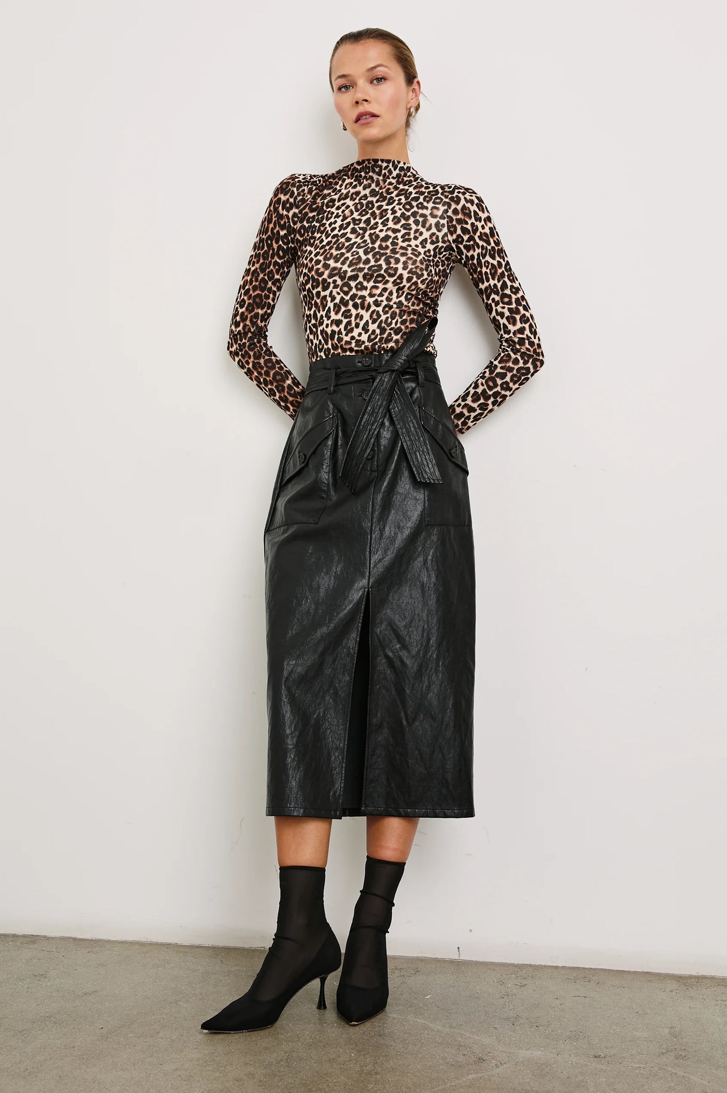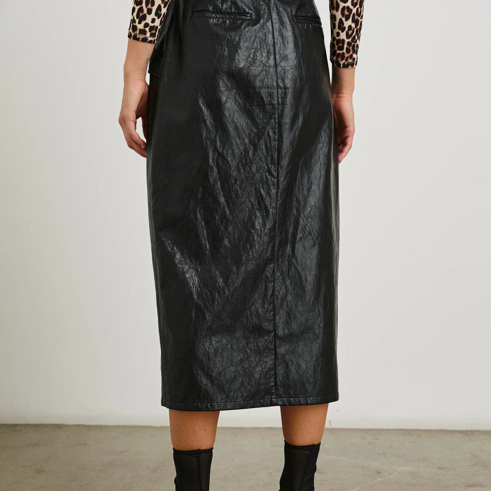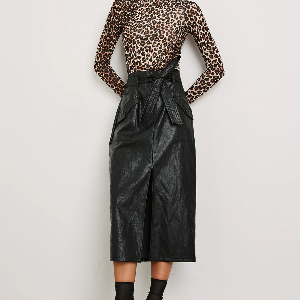 Steal the spotlight in this faux crinkle leather skirt, designed to make a statement. Complete with a middle slit, adjustable belt cut from the same fabric, and folded side pockets, this skirt is ready to style all season long and beyond.