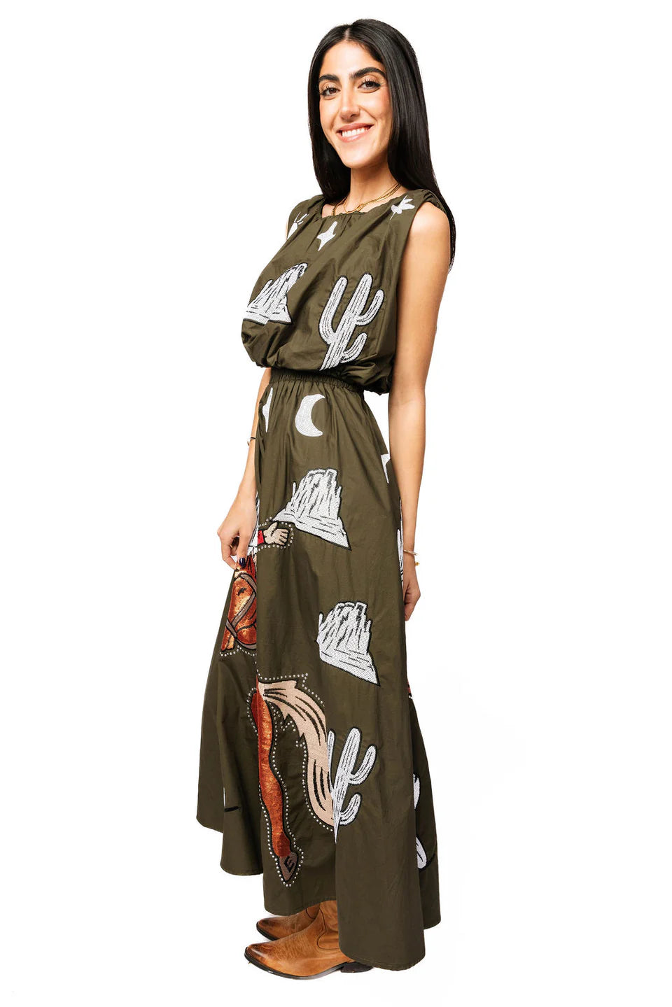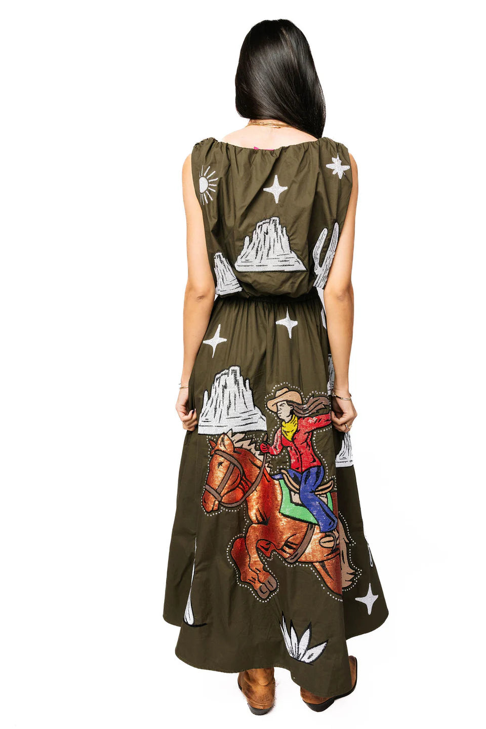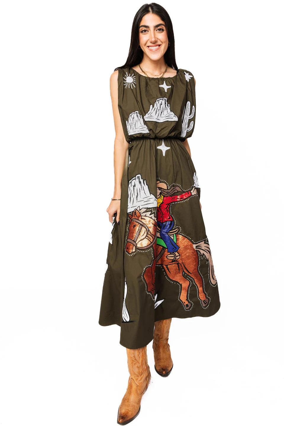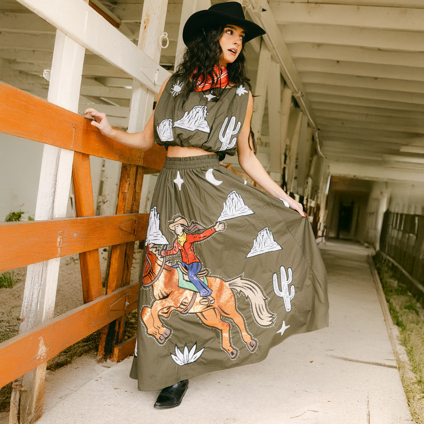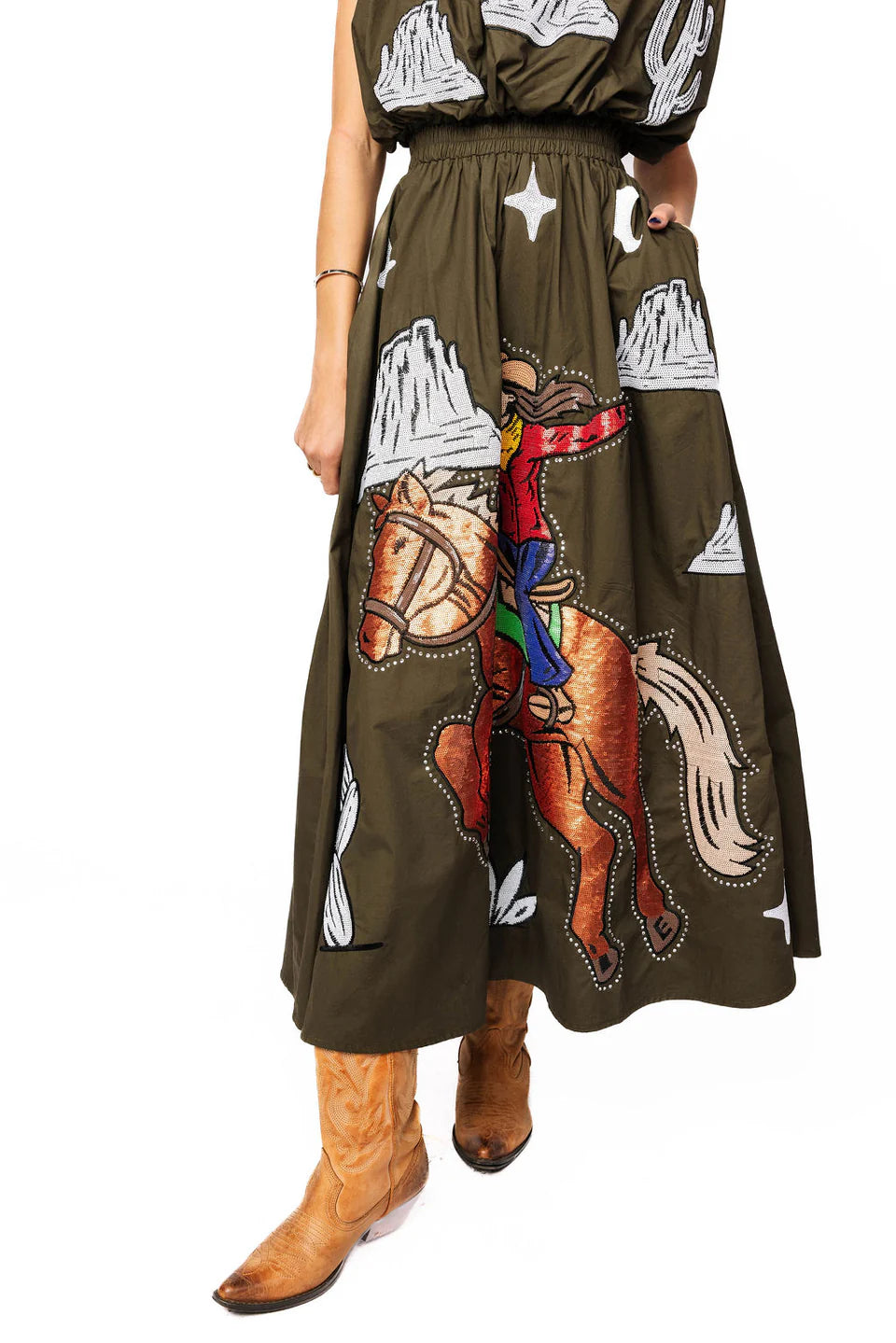 Saddle up in this dark green midi skirt featuring a bold bucking cowgirl design that demands attention. The ivory accents add a classic Western touch that pairs perfectly with our matching top for a head-turning coordinated look. Crafted from quality cotton, this skirt brings that spirited rodeo energy to your everyday style. Whether you're channeling your inner cowgirl or just love statement pieces with personality, this is the skirt that says you're ready to ride.