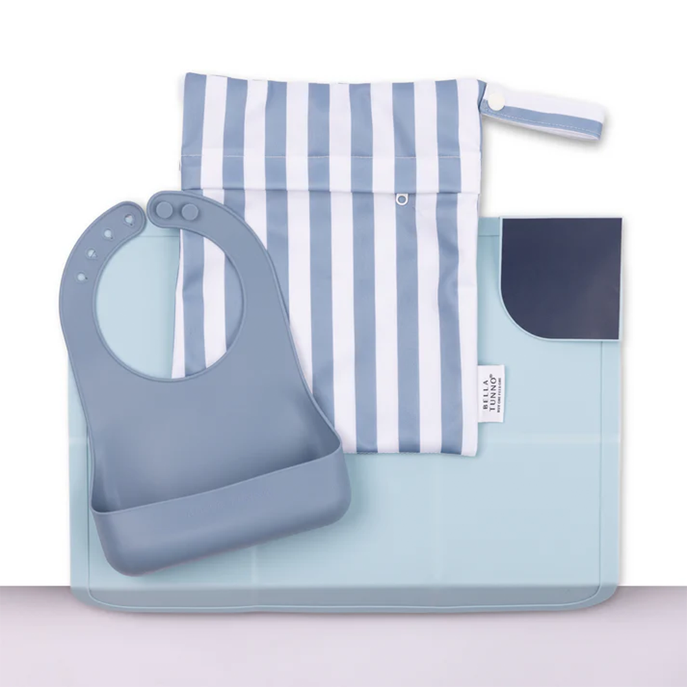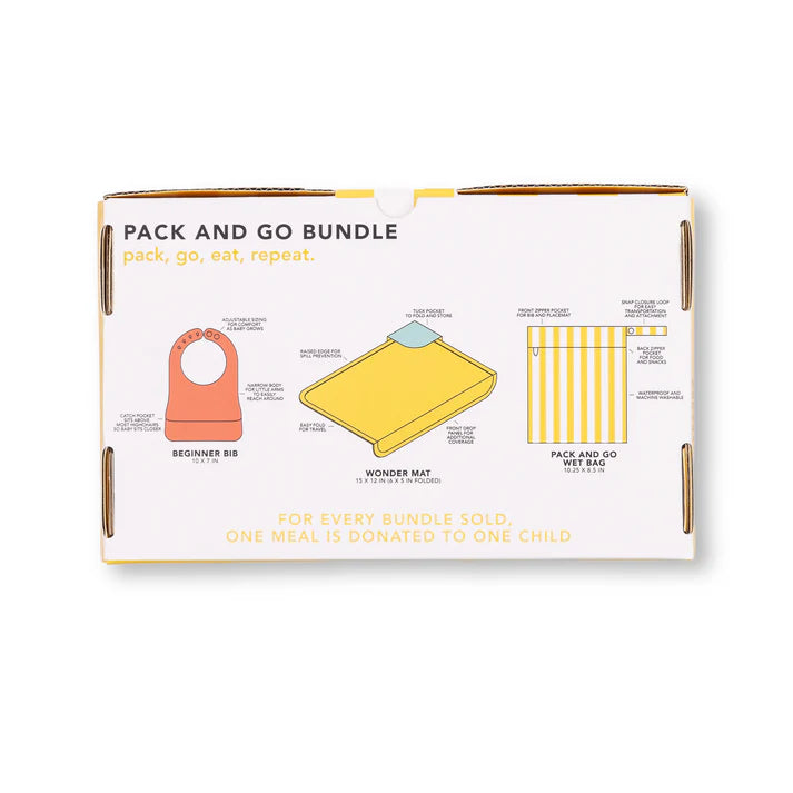Pack, go, eat, repeat! Introducing our expert-approved toolkit of mealtime essentials to take on-the-go! This set is the perfect new baby gift and a parent must-have. Is that mess going to be for here or to-go? Just pack up the bib and placemat in the on-the-go bag, throw in some snacks and meals can happen anywhere.