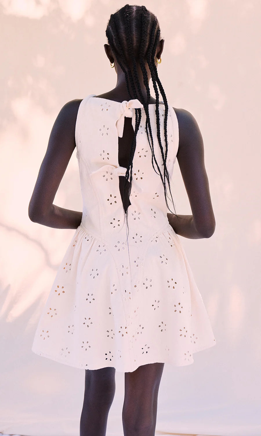 Our May dress combines timeless elegance with modern design. This mini dress features a crisp straight neckline and structured princess seams that create a flattering silhouette. The denim fabric showcases delicate flower eyelets for visual interest. Godets at the skirt add graceful movement and dimension, while the tie-back detail offers a flirty finishing touch.