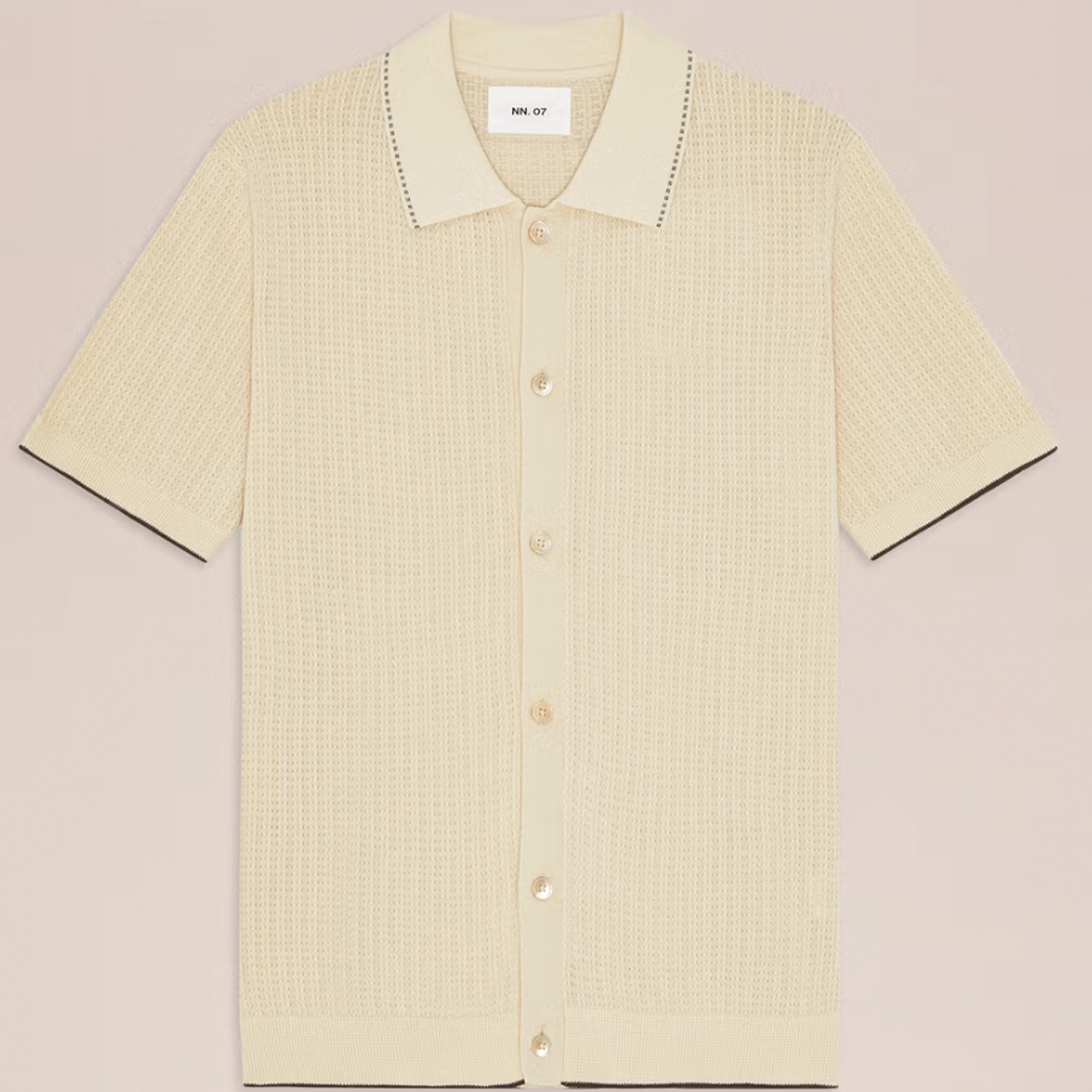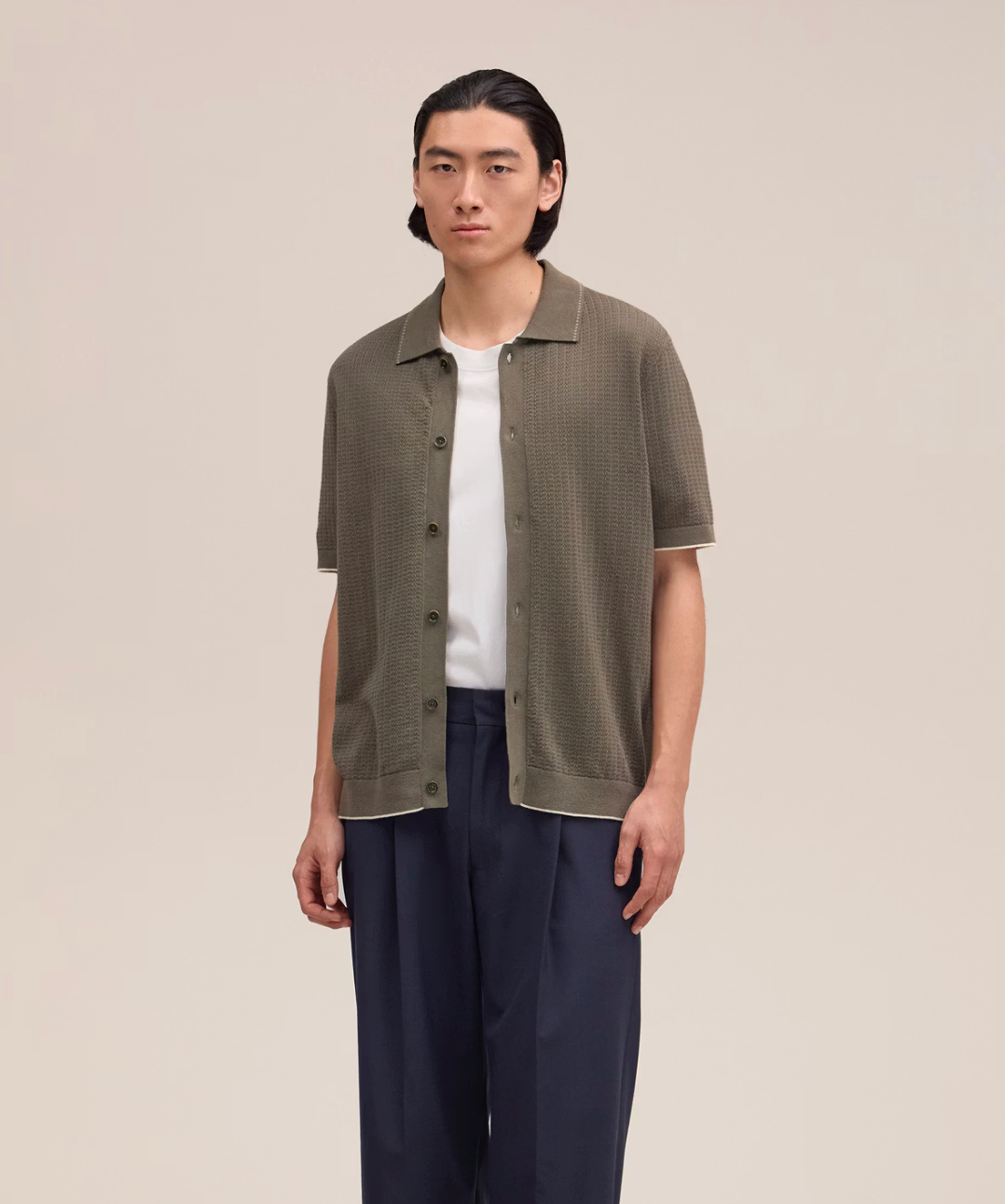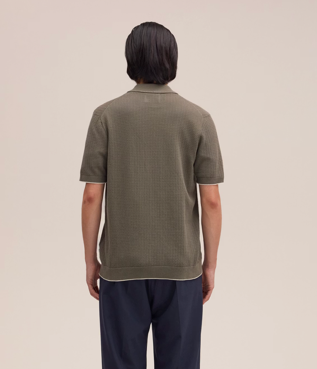 Cotton polo crafted with a crisp, textured stitch and contrast detailing. Finished with plain Corozo buttons on a clean placket for a refined, casual look.