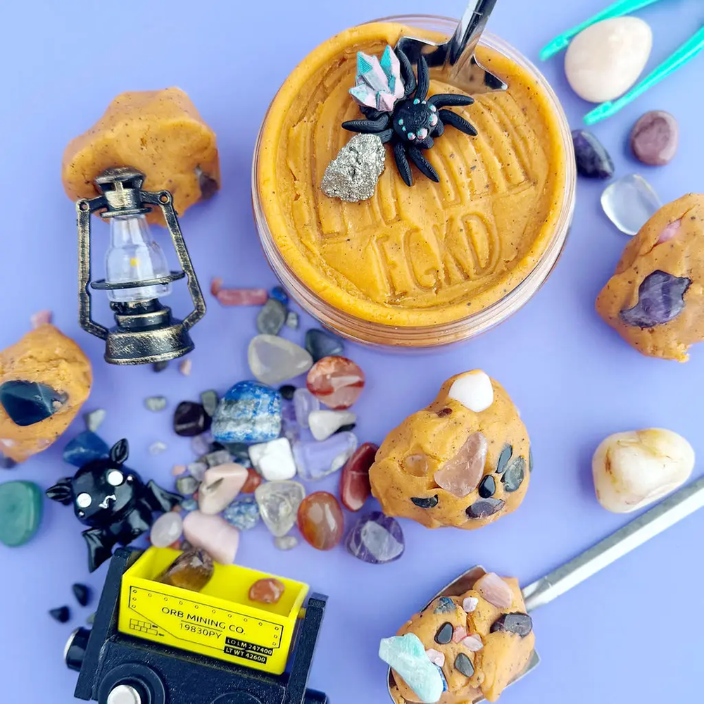 Crystal Mine Includes: Terracotta Red (Prickly Pear) KidDough filled with rocks and gemstones, Bat Figurine, Mining Cart, Shovel, Gold Nuggets and Polished Rocks