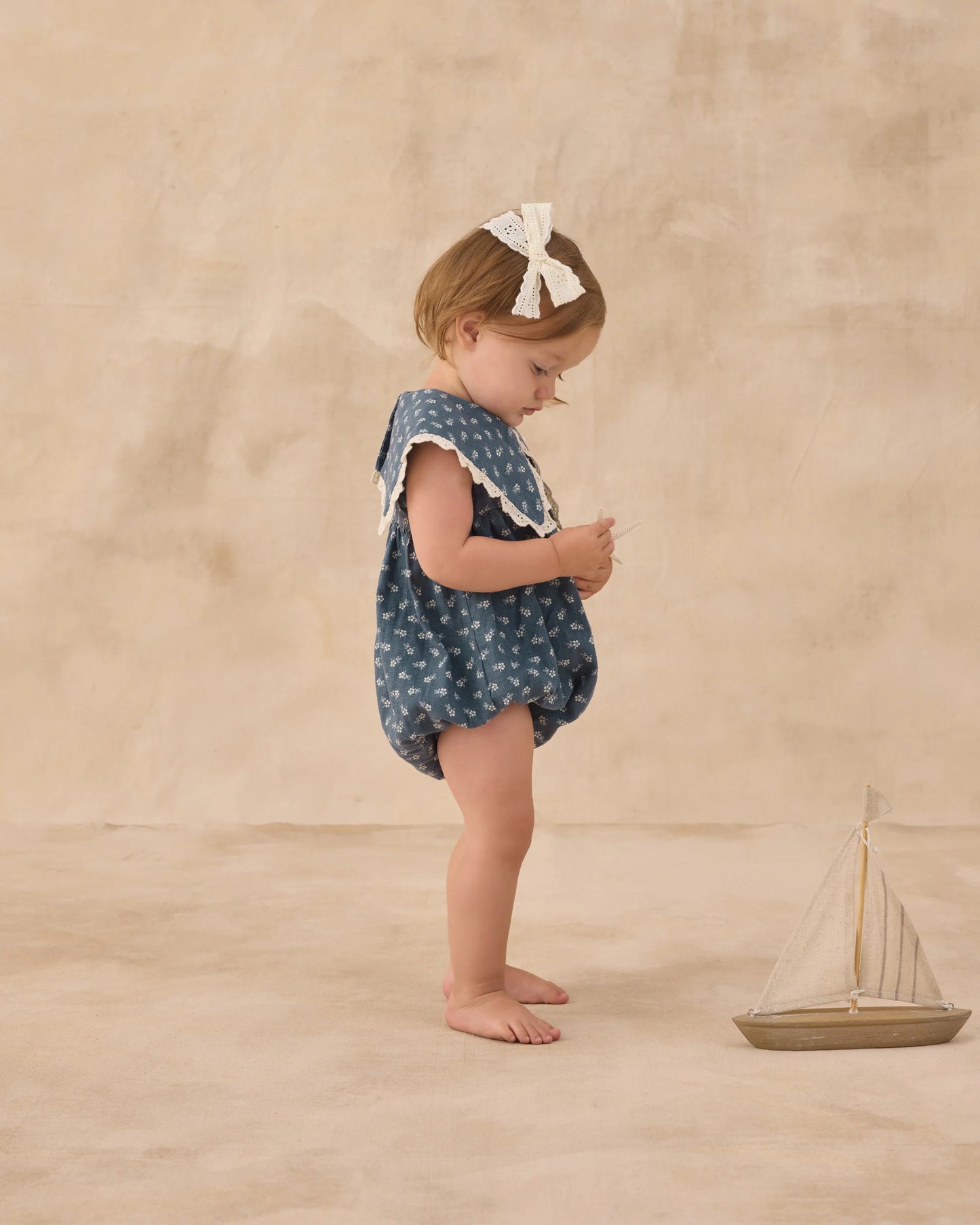 Our Porter Romper is perfect for playtime this spring! Featuring an oversized sailor v collar and elastic leg openings, it's both easy and adorable!