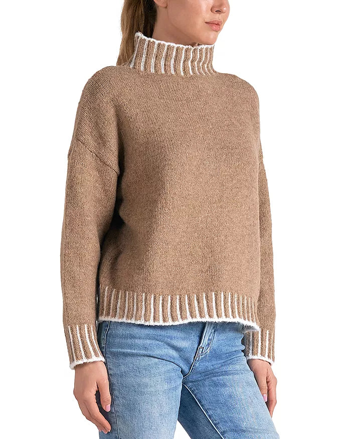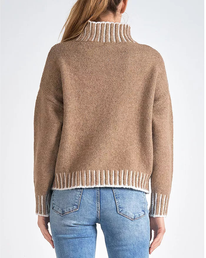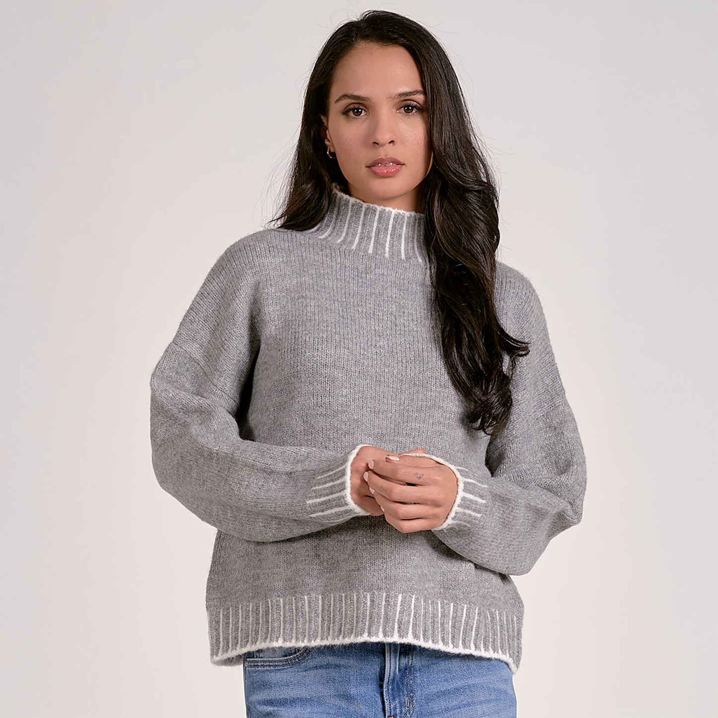 The Valma sweater wraps you in warmth. Contrast stitching on hems, sleeves, and neck add visual intrigue to this cozy mock turtleneck cold-weather essential.