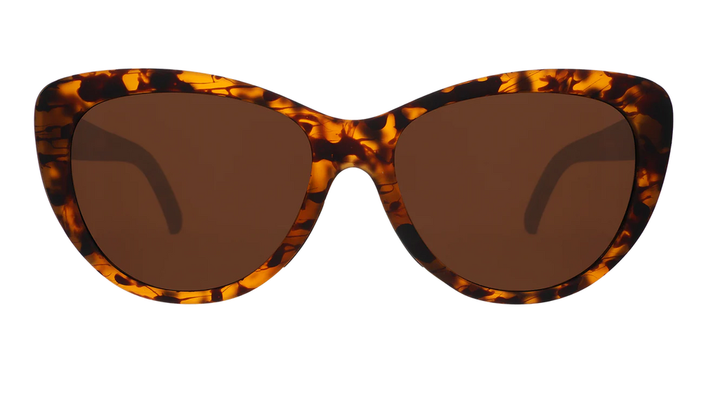 ME-OW!!! Take a walk on the wild side in these ferociously fashionable brown tortoiseshell sunglasses with brown non-reflective lenses and gold accents. WARNING: Wearing may result in an uptick of runway catfights due to extreme style envy.